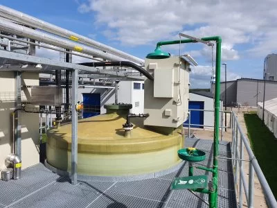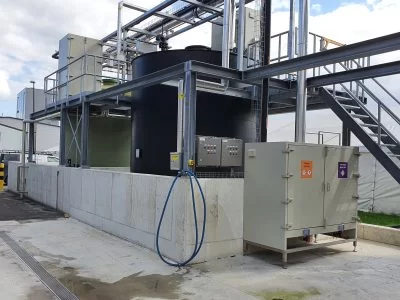 Deze tanks zijn geplaatst in een bouwkundige lekbak en het bordes is rondom de tanks geplaatst zodat de doseerkasten vanaf dit bordes goed bereikbaar zijn.