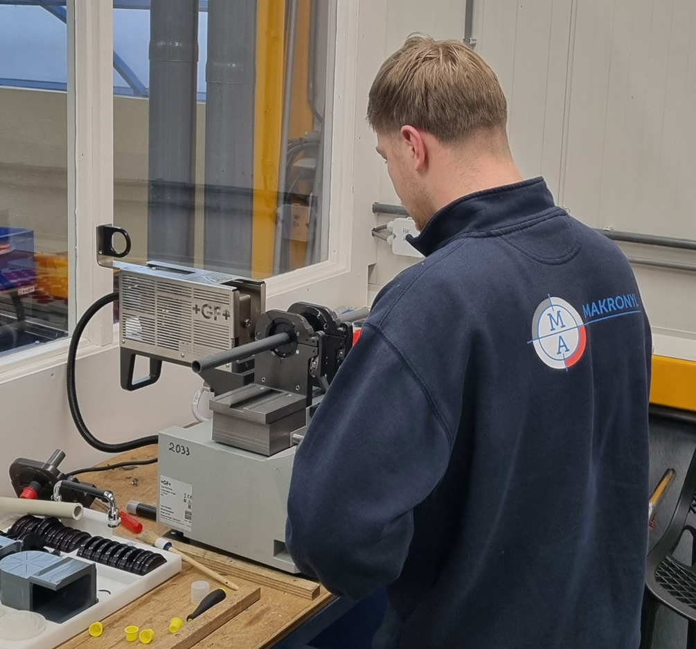 Toepassing: De inzet van infrarood (IR) lassen van PVC-U leidingsystemen biedt grote voordelen ten opzichte van het voor kort gangbare verlijmen van PVC-U. Makronyl maakt gebruik van o.a. de +GF+ IR-63M en110 lasmachines waarmee het lasproces geautomatiseerd is geworden en een reproduceerbare lasverbinding gegarandeerd is. De kans op verbindingslas lekkages is hierdoor gereduceerd tot een absoluut minimum.